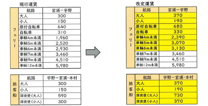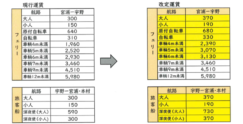 つきましては、今後も航路の維持と更なる安全・安心の確保、そして持続的なサービス提供を図るため、誠に不本意ではございますが、下記の通り宇野~直島航路の運賃を改定させていただきたく、謹んでお願い申し上げます。