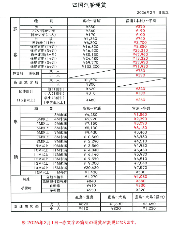 ◆対象航路  : 宇野~直島(宮浦・本村・風戸)航路(以下の表は抜粋)