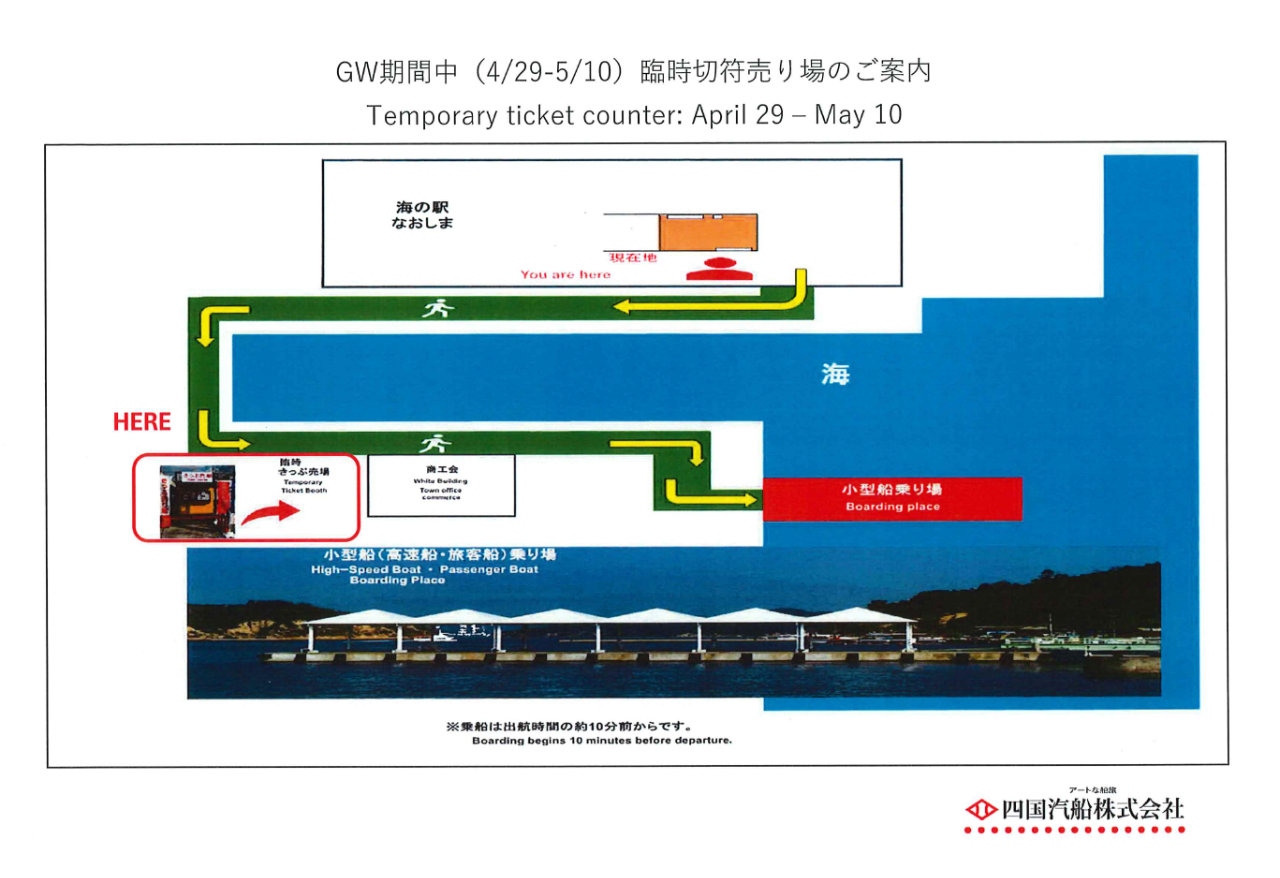 GW期間中は、切符発売窓口が「海の駅なおしま ⇒ 臨時切符売り場」に変更となります。